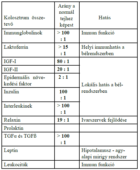 A kolosztrum egyes biológiailag aktív összetevői, például az inzulin, IGF-I, relaxin és egyéb növekedési faktorok, illetve hormonok szintén fontos tényezők lehetnek a fejlődési folyamatokban. Amennyiben a borjú nem megfelelő mennyiségben vagy egyáltalán nem jut kolosztrumhoz, az negatívan befolyásolja a szervezet fejlődését, illetve a takarmányértékesítést és -hasznosulást. Az elmélet igazolására Soberon és Van Amburgh (2011) vizsgálta a kolosztrummal való ellátottság hatását a választás előtti napi testtömeg gyarapodásra és a különböző mennyiségű kolosztrum itatás befolyását a tejpótló tápszer felvétel mennyiségére.
