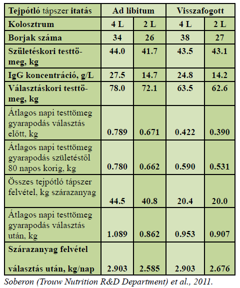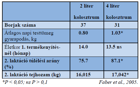 ..Azokat a borjakat, amelyek 4 liter kolosztrumot és ad libitum tejpótló tápszert kaptak összehasonlítva azokkal, amelyek 2 liter kolosztrumot és ad libitum tejpótló tápszert kaptak, a következőket tapasztaltuk: a 4 liter kolosztrumot kapott borjak tejpótló tápszer felvétele 8,5 %-al magasabb volt, a választás előtti átlagos napi testtömeg gyarapodásuk 18 %-al magasabb volt és a választás után a 80. napig a szárazanyag felvétel 12 %-al, az átlagos napi testtömeg gyarapodás pedig 25 %-al volt magasabb. Mindezekből levonható, hogy a kolosztrum valószínűleg befolyásolja az étvágy szabályozását, amelyen keresztül javítja a testtömeg gyarapodást és a takarmány értékesítést, ezáltal pozitív hatással van a jövőbeli tejtermelésre is.